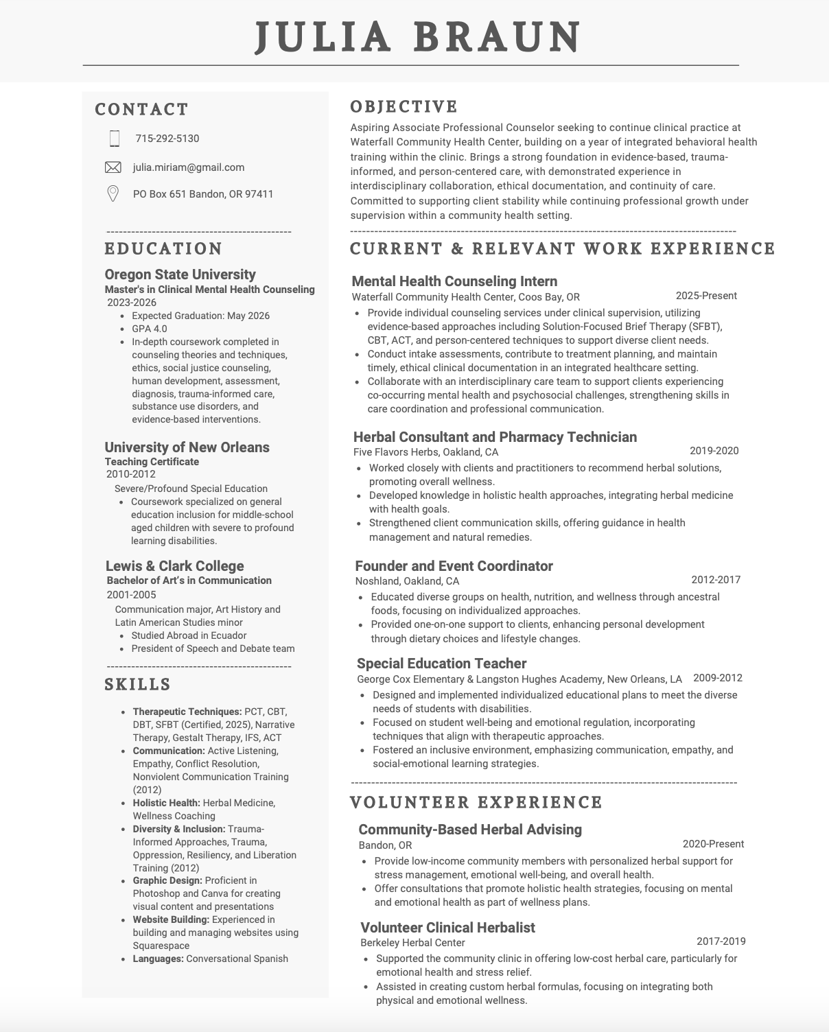Degree: I am currently pursuing a CACREP certified Master’s Degree in Clinical Mental Health Counseling through Oregon State University, with an expected graduation in May of 2026